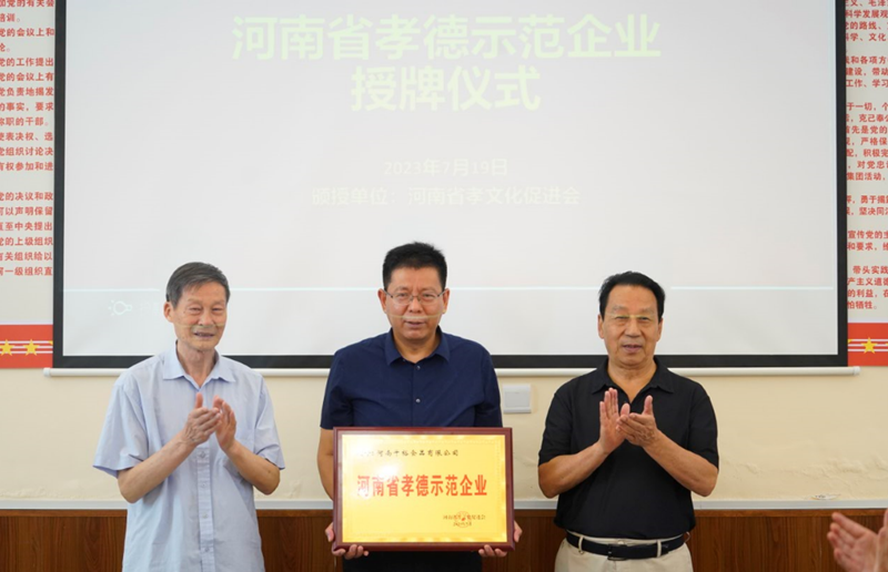 省孝文化促進會名譽會長閻德才、省鄉村振興協會會長史獻志共同授予千裕食品公司河南省孝德示範企業銅牌